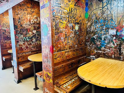 Sandwiches with distinct sourdough buns served in a casual, offbeat space with graffitied booths.